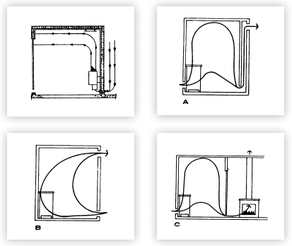 The diagram shows the proper location of the vent openings. The inlet should be located below the heating unit (or close to it) and the outlet is located on the opposite side, on the ceiling or just below the ceiling. Recommended ventilation openings are 4” to 6” diameter, depending on the size of the sauna room.